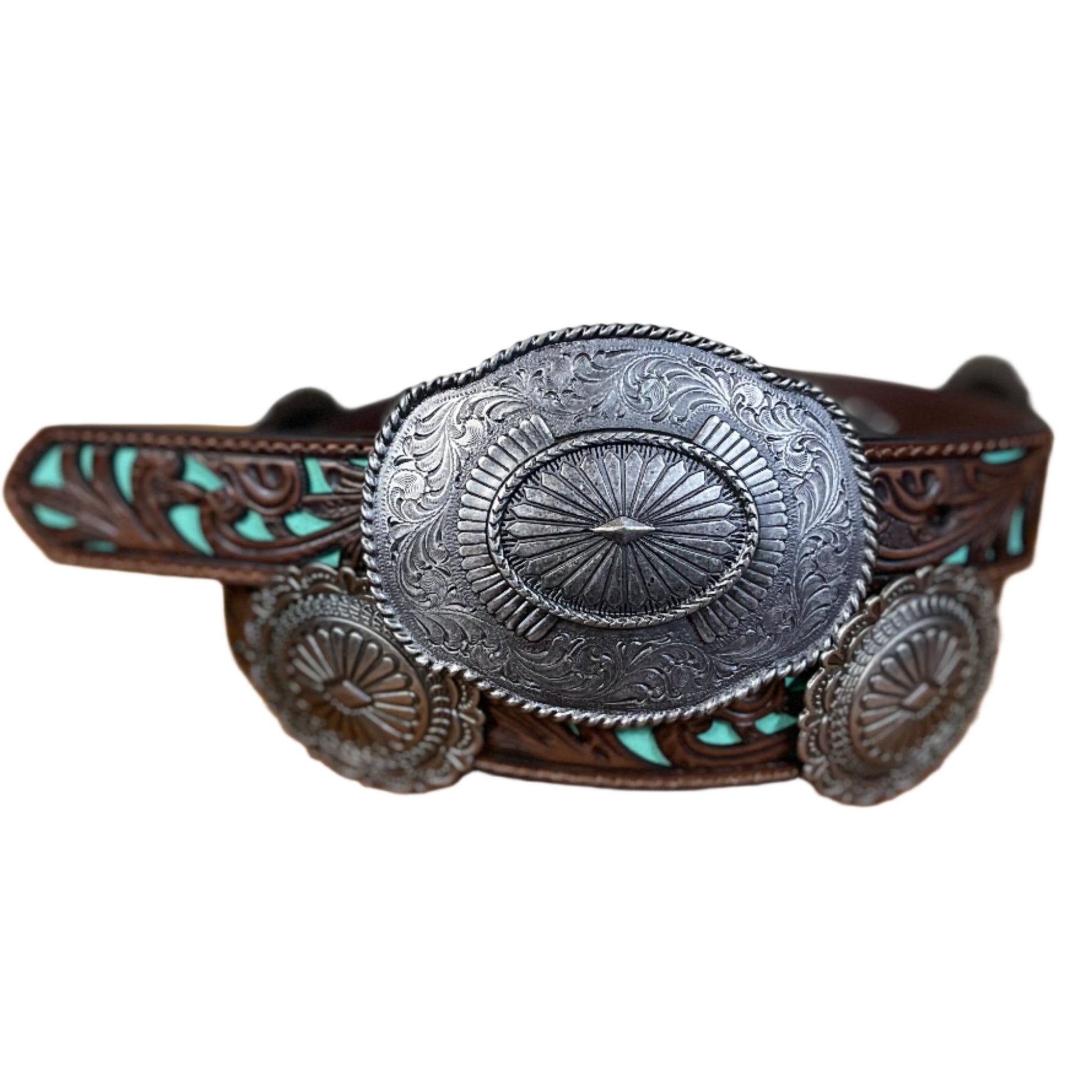This ladies Ariat belt by M&F Western Products has a stylish western look. The tan floral embossed pierced strap is 1-1/4” wide. It is accented with large round floral silver conchos. This belt would look great with your favorite oversized shirt.