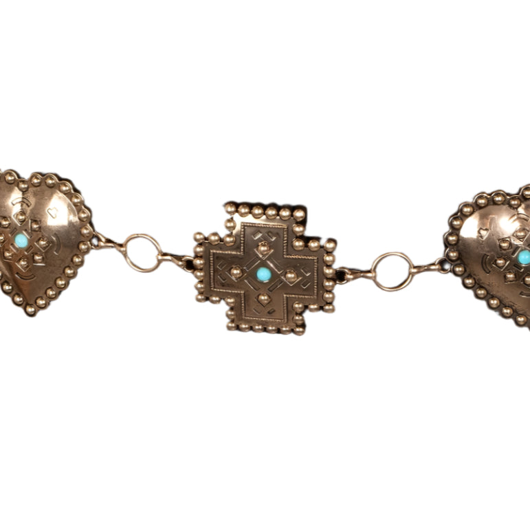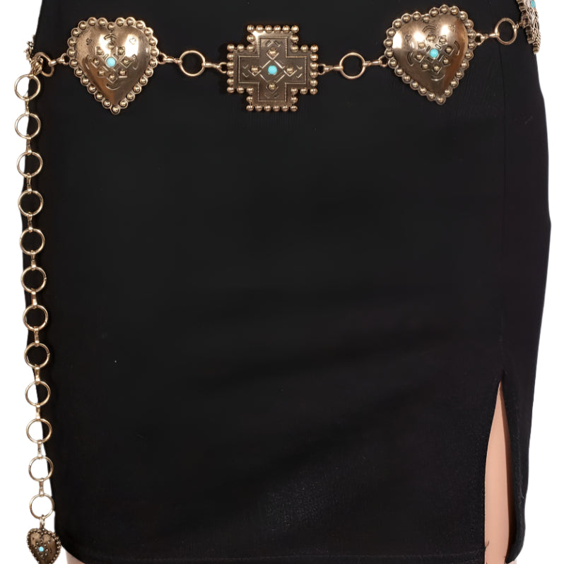 This chain belt adds a modern turquoise stud heart and cross concho style. Explore a refined sense of style with this chain belt, seamlessly elevating the chic factor of your look.