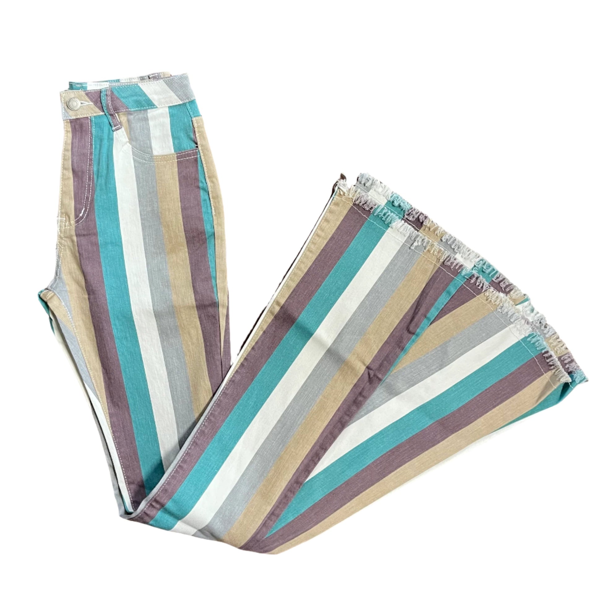 The Turquoise multi stripe jeans are super flared, stretchy and feature distressed hems.