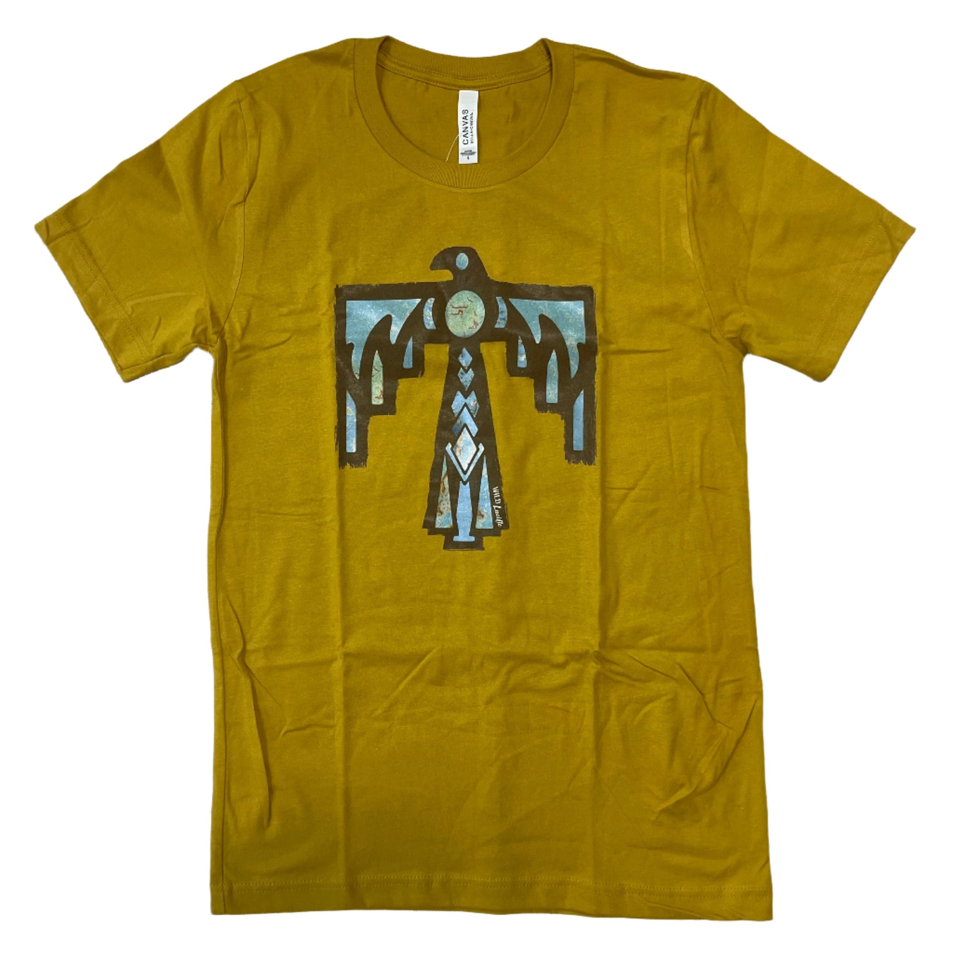 The Turquoise Thunderbird tee comes in ginger and it features a turquoise thunderbird design on the center.