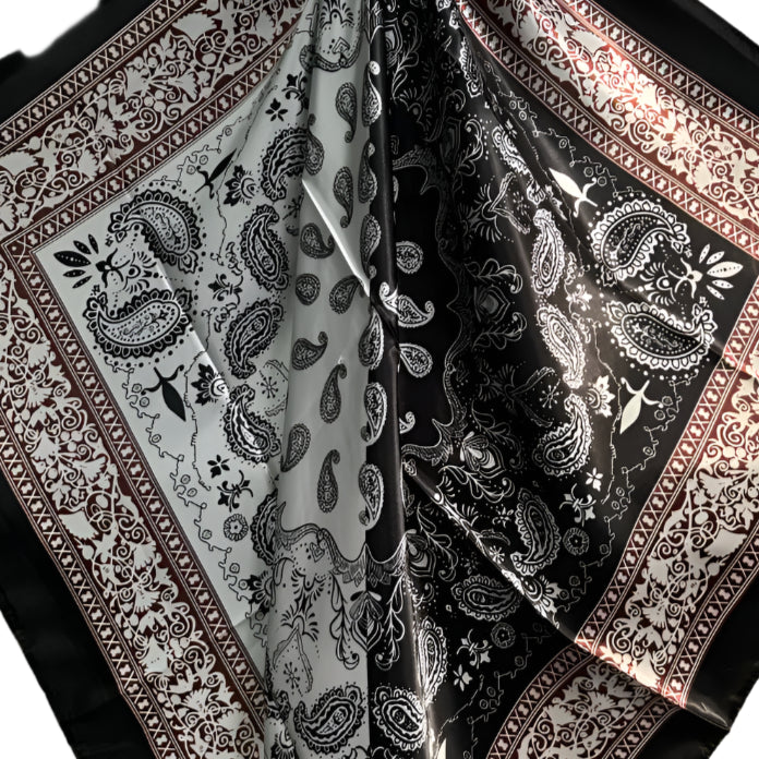 The Two Tone Black Paisley wild rag/scarf . It is a square and measures 35" x 35". A perfect look for any rodeo event or a night out on the town. Can be just knotted or complimented with a concho slide. 100% machine washable polyester, silky and soft.