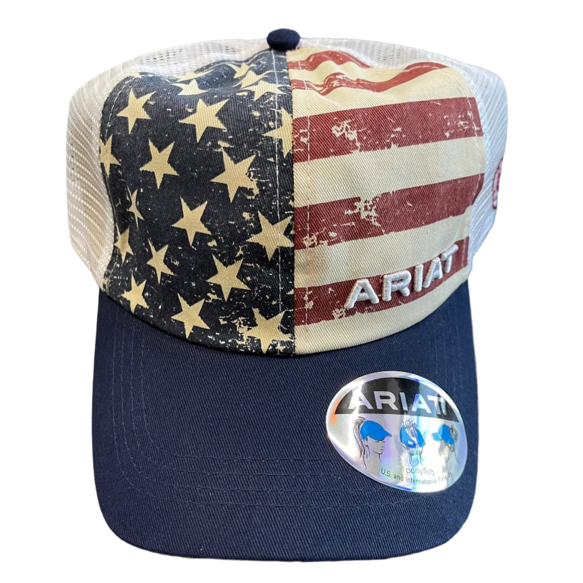 Distressed USA flag on front panels with offset Ariat logo embroidered. Navy bill, and white mesh back with dark red shield embroidered on the left side. Velcro closure with opening for ponytail.