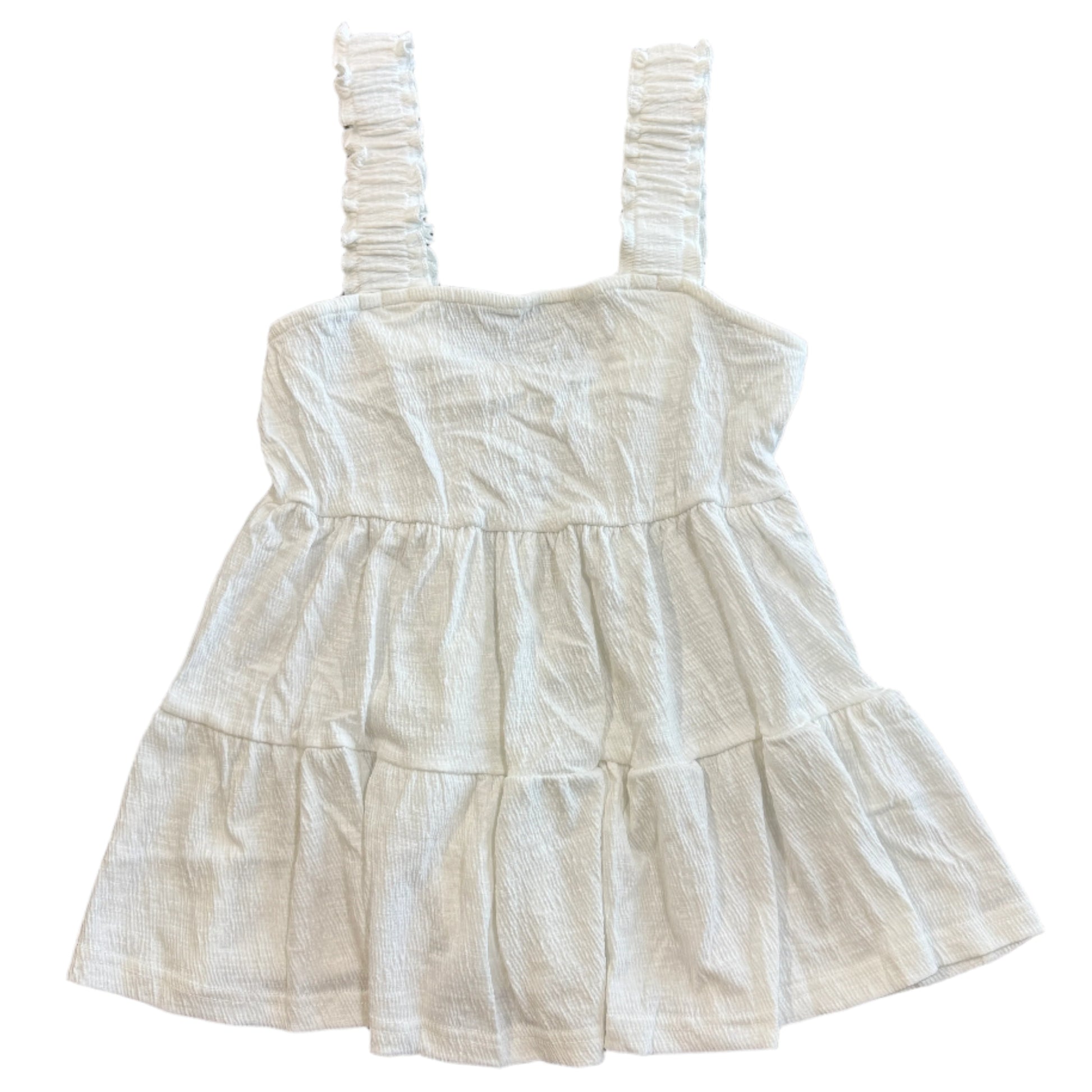 This solid tank top offers a versatile and classic look. Embrace the textured crinkled fabric, adding depth and interest to your outfit. Stay on-trend with the ruffled straps, bringing a playful and romantic touch. Define your waistline with the flattering peplum silhouette.
