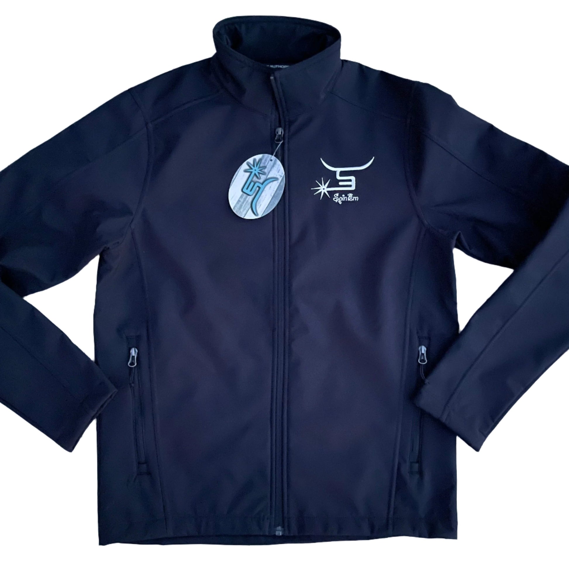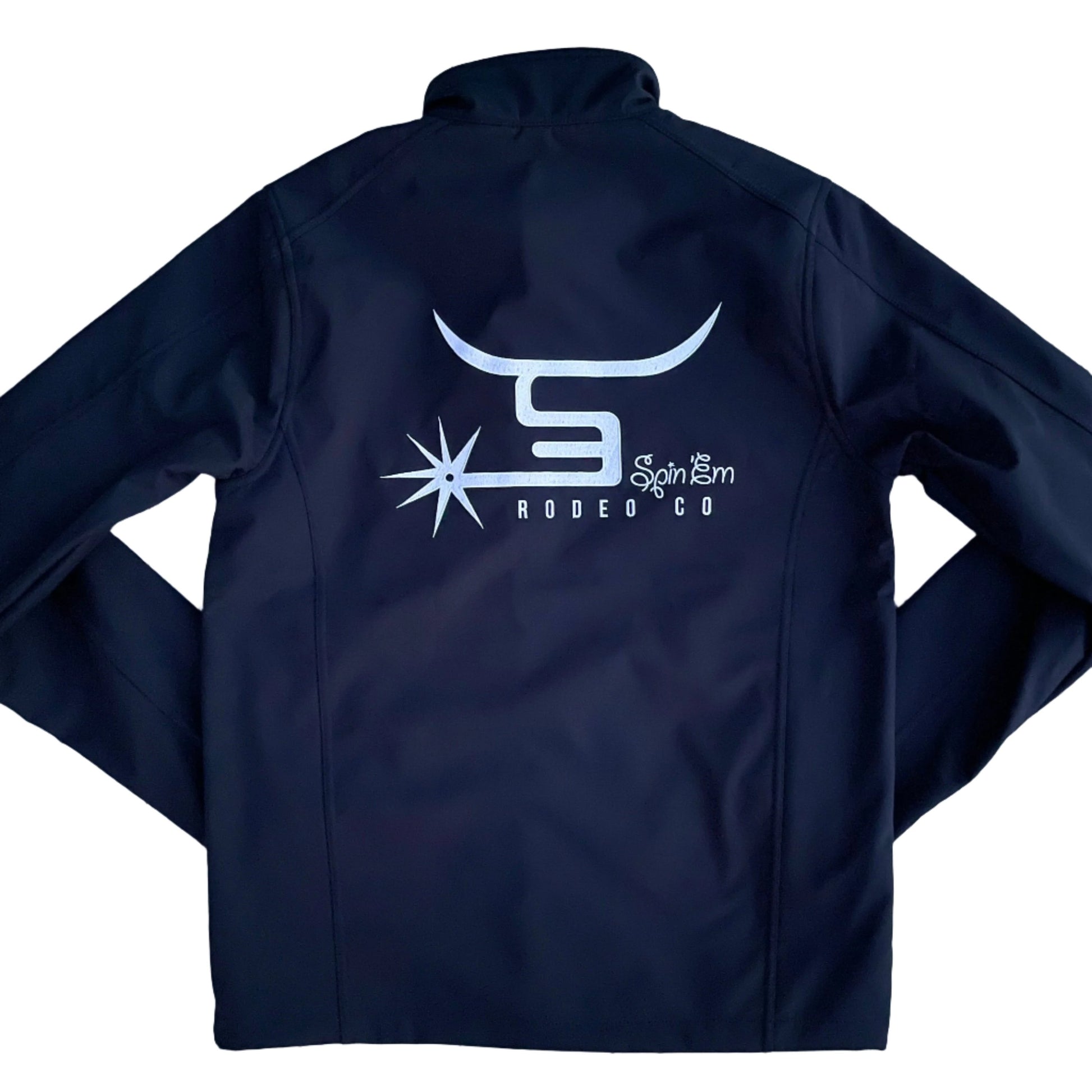 The Men's Spin Em Rodeo Co. Softshell jacket comes in black with an embroidered Spin Em white logo both on the front left chest area and on the back. The jacket is made of 100% woven polyester and is water resistant.