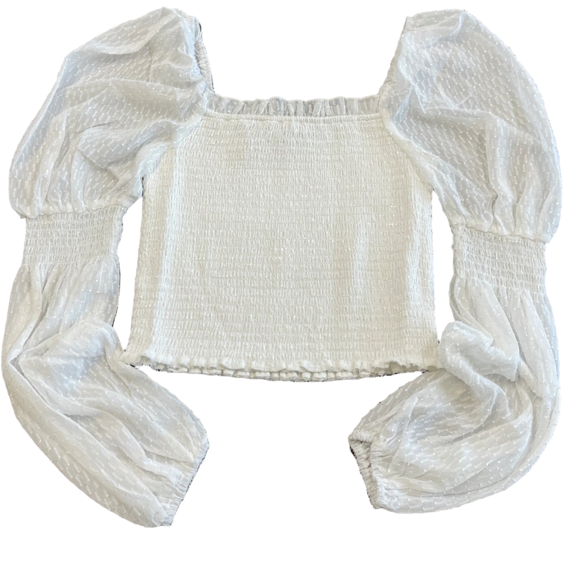 The women's white smocked top features a square neck with puff long sleeves and dot texture on the sleeves.