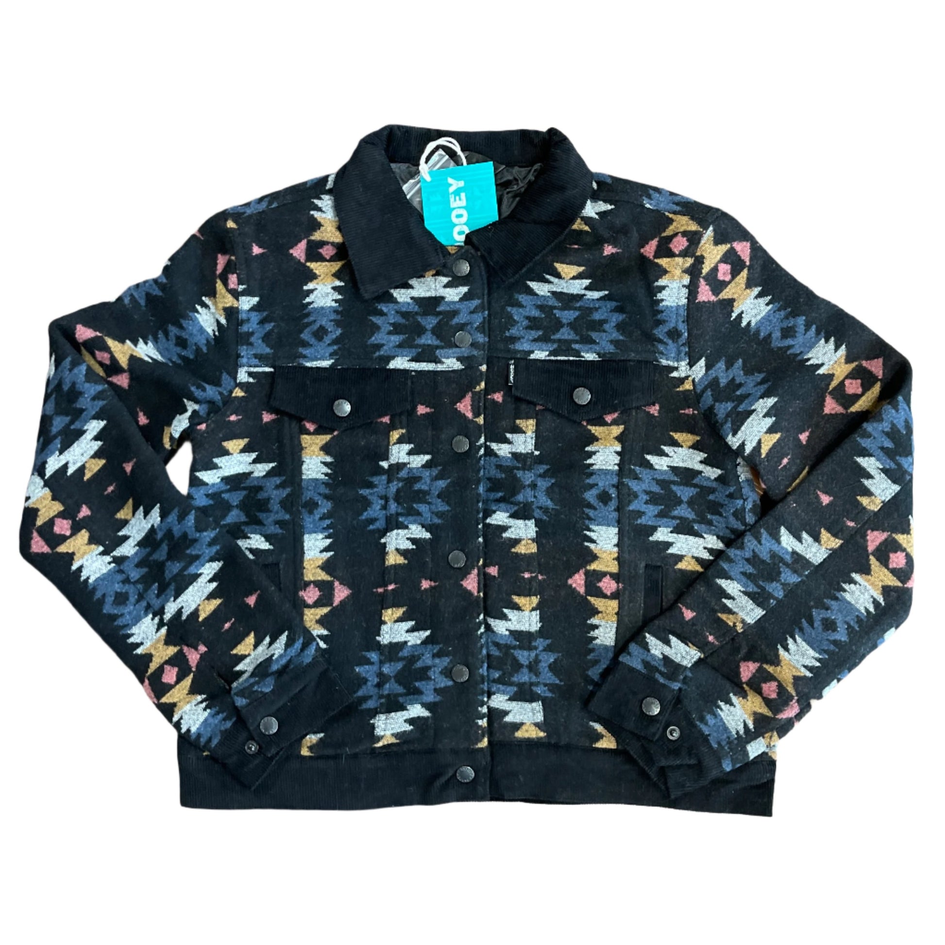Hooey Ladies Black Jacket with Multi Colo Aztec Pattern all over with black velvet trim.