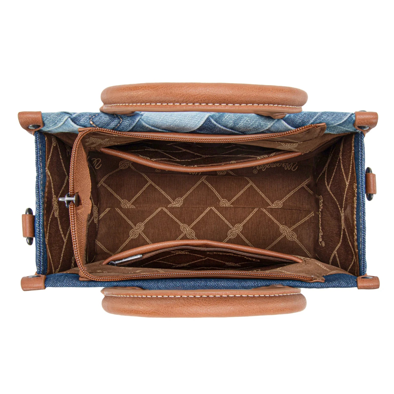 Made of Denim fabric and PU leather trimmed, this tote/shoulder bag/crossbody has:
