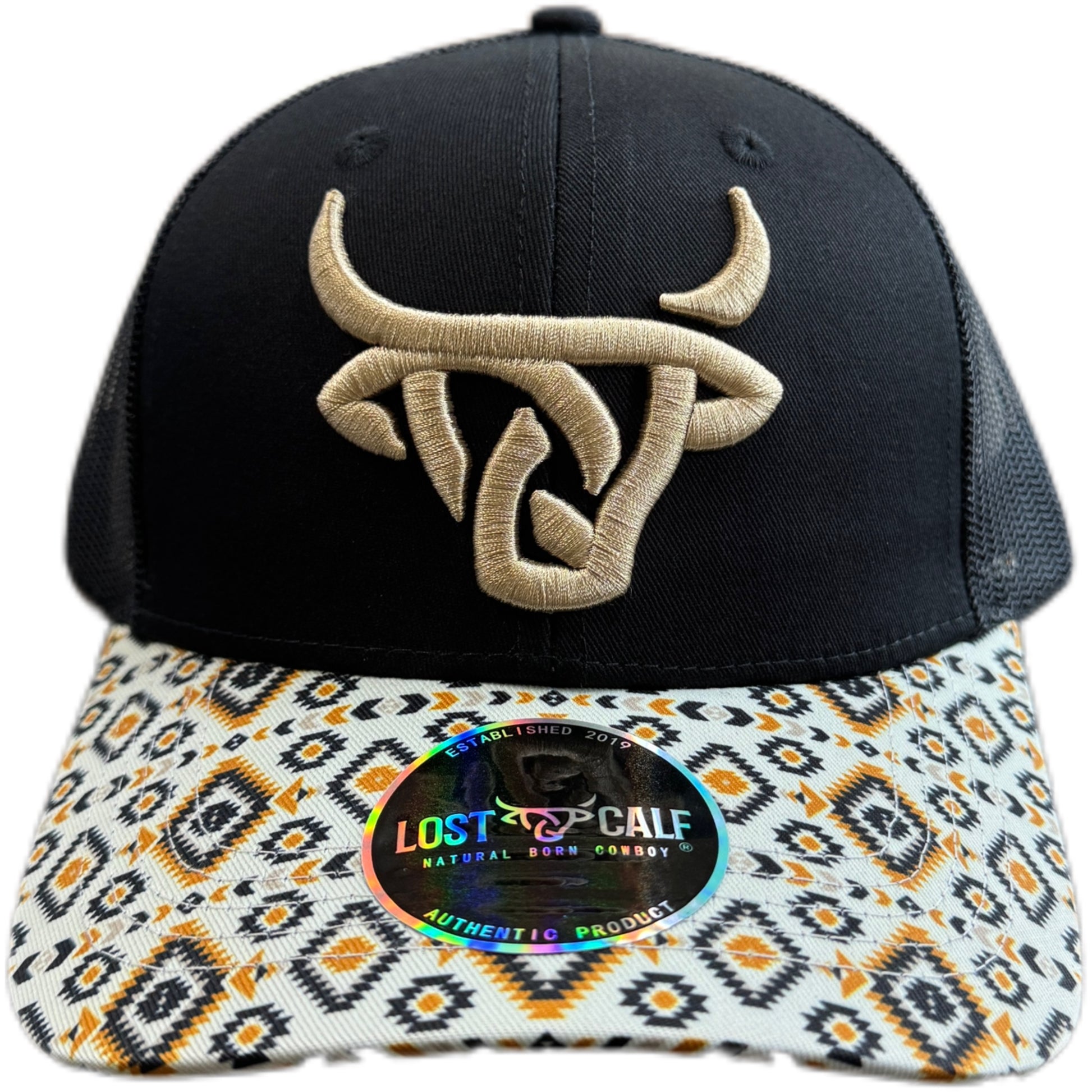 Classic Trucker cap with 3D stitch and Aztec color bill Lost Calf logo embroidered on front, Lost Calf stitched on left side. Snap back - one size fits all.