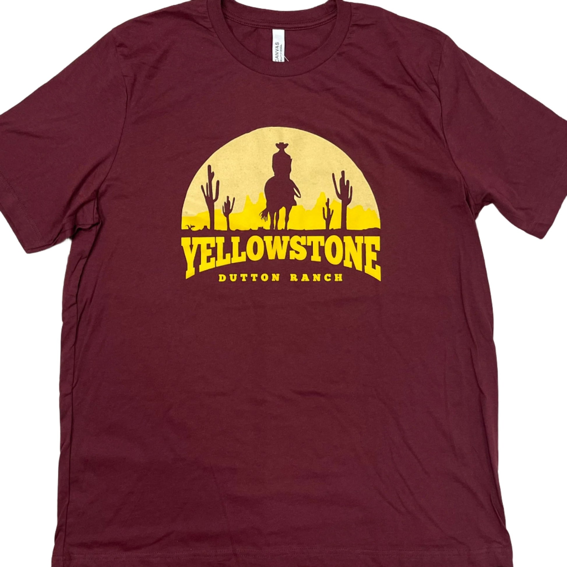 The maroon Yellowstone Dutton Ranch tee features a graphic design in yellow.