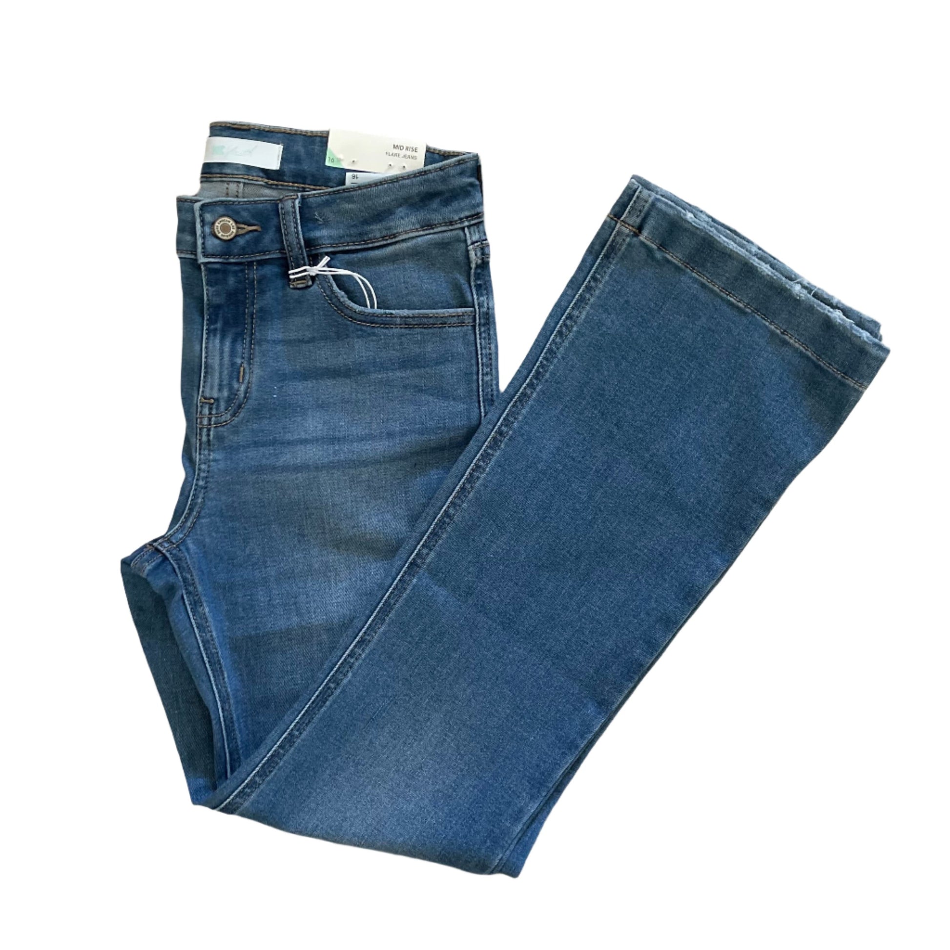 The Aster Mid Rise Flare Kid Jeans are a classic flare look that rises right at the hip and flares out at the bottom. Comes in our dark wash with mild fading and whiskering. Features a 5-pocket style, single front button closure, and zip fly.